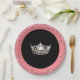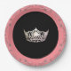 These pageant festive paper plates are great for serving up some fun (and easy clean up too) for your next pageant get together. Add your pageant theme or pageant name if desired. Shown here is a bright Coral-Pink rim and a gleaming Silver crown print in the centre over chic Black background. Silver-Grey coloured frills on the edge. Personalize or buy as designed.