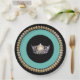 These pageant festive paper plates are great for serving up some fun (and easy clean up too) for your next pageant get together. Add your pageant theme or pageant name if desired. Shown here is an Aqua-Turquoise rim and a gleaming Silver crown print in the centre over chic Black background. Gold coloured regal trim on the rim. Personalize or buy as designed.