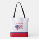 This cute stylish medium tote bag is shown in White with text reading "America" above an American Flag on an angle. A Silver-Grey coloured tiara-crown sits on the American flag. Has bottom strip of Red with Royal/Navy Blue thinner stripe.