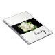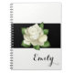 Notebook shown with a photo print of a White Rose print on a black background and a personalized name. Notebook shown in White, but choose your colour of background. Customize this item and change the name to yours or take off, or purchase as shown.