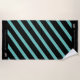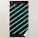 This beach towel is shown in a Black background with bold Aqua colour stripes and with a print of a gleaming Silver pageant crown. Has sample text for you to personalize with your own name or title.