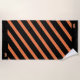 This beach towel is shown in a Black background with bold Orange colour stripes and with a print of a gleaming Orange pageant crowns on opposite ends.