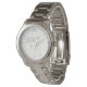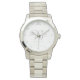 Shown in Silver coloured Stainless steel, this bracelet style watch has a White face with Silver-Grey numerical time markings, Silver-Grey coloured fancy scroll-work crown at 12 Noon, your Three personalized monograms and a custom text line beneath for your title, special date, etc. Has second sweep hand. Choose your favourite style of watch, etc. Customize this item.
