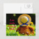 Cute photo of a lonely stuffed critter, wearing a bonnet and holding a flower while waiting in a meadow, is featured on this postcard. With the message, "I am really missing You!", this postcard is a great way to keep in touch when a loved one is far away!