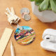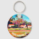 This colourful souvenir displays a landscape painting made with vinyl paints and coloured pencils featuring the Mission Historical Park from Santa Barbara, CA. If you wish to customize this keychain as a gift, you can replace the wording with any text you like.