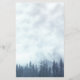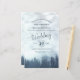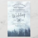 This wedding invitation is rustic and beautiful, while still being budget friendly. It features a rugged alpine design with mountains covered in blue pine trees shrouded in mist or fog. The typography features lacy script calligraphy and a sophisticated layout. Perfect for an outdoor or backyard ceremony.