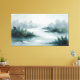 This abstract landscape painting evokes a calm and ethereal atmosphere. Soft and muted shades of green, blue and white create a harmonious composition. The brushstrokes are loose and expressive, giving the impression of fluidity and movement. The painting depicts a misty and watery scene, a river or lake surrounded by lush greenery. The overall impression is one of serenity and peace.