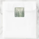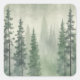 An ethereal and atmospheric digital painting or illustration depicting a dense coniferous forest shrouded in thick mist or fog. The tall, slender pine and evergreen trees create layers of depth, with the foreground trees showing more distinct detail and deeper shades of green, while the trees receding into the background fade into soft, pale, and desaturated hues of sage and grey. The overall mood is calm, mysterious, and tranquil, evoking the feeling of a quiet morning deep in the wilderness.