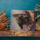 Misty the adorable little poodle mix painted by Traci Van Wagoner laying a striking tan and red pillow with one ear perched high on her head.