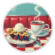 Cute kitchen cabinet knobs with an illustration of blueberry and mulberry pie with melting vanilla ice cream on top with a warm cup of coffee at a retro diner.