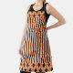 This apron design is a fun fall mix of patterns. The main pattern is made up of stripes, while the top and bottom borders are made up of an argyle pattern.The colours throughout are black, orange and white.