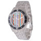 This men's watch has a simple design of vertical stripes of varying thicknesses in red, orange, purple, black, light blue, and white.