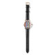 This women's watch has a simple design of vertical stripes of varying thicknesses in red, orange, purple, black, light blue, and white.