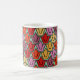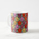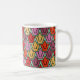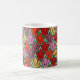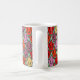 This mug has an art deco design of tulips from pentagons and trapezoids in orange, red, purple, gold, and green.