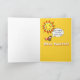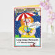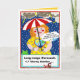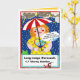 Visuel avec du charme d'art populaire d'une femme de sourire avec un parapluie sous la pluie. Une scène ensoleillée est à l'intérieur de son coeur tandis qu'un oiseau bleu chante dire : Je ne chante pas parce que je suis heureux, je suis heureux parce que je brûle légèrement. L'avant de la carte a également un serpent rouge et blanc dans un boa et un casquette fait varier le pas chantant le temps orageux au-dessous de l'étiquette : Prévision à longue portée. La carte intérieure lit : Je chante pour votre visage ensoleillé. Mlle You ! ! ! ! !