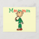A Christmas holiday T-shirt design featuring a stick figure kid eating a candy cane and text of red and green that reads "Mmmmm".