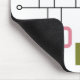 This mouse pad has a mid-century modern design that looks like a mobile with solid and open squares hanging from it in teal, orange, green, red, and beige.