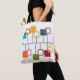 This tote bag has a mid-century modern design that looks like a mobile with solid and open squares hanging from it in teal, orange, green, red, and beige.