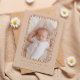 Whimsical and sweet birth announcement card featuring hand drawn photo frame in squiggly mocha brown line.