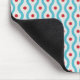 Mod pattern of wavy blue stripes and red dots on a white background.