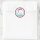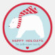 Modern and customizable holiday stickers featuring a festive polar bear wearing a red and white striped scarf on an ice blue background. Editable text boxes for your greeting and name.