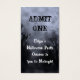 Un ticket d'Halloween de taille carte de visite avec des lettres grunge noir et blanc contre un ciel d'Halloween éffrayant avec des arbres brumeux le long d'une route obscurcie, des corbeaux gothiques et une pleine lune nuageuse avec une brume bleue. Cliquez sur Customiser pour modifier les polices, ajouter du texte, modifier les tailles des cartes, ajouter du texte au verso et plus encore, même enregistrer votre conception pour plus tard. Visitez mon magasin pour trouver tous les produits correspondants à ce design.