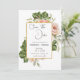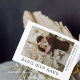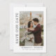 Cette élégante carte de faire-part de mariage comporte un cadre doré avec une rose aquarellée et une branche de verdure comme arrière-plan de modèle. Les mots « Sauvegarder la date » sont écrits en police noire sur fond blanc. Le nom du couple, la date et le lieu du mariage sont également inclus en police noire sur fond blanc. Une photo élégante du couple est ajoutée à la carte avec leurs noms et la date et le lieu du mariage écrits en dessous.