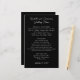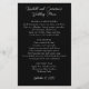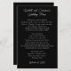 Menu mariage abordable en noir et blanc neutre. Papier noir avec modèles de texte blanc ont les noms du couple avec le titre du menu en haut. Tous les éléments du menu sont ajoutés dans un seul paragraphe. Ajoutez des espaces de préférence à des espaces de texte. La date de l'événement est au bas du document.