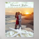 Pancarte de poster de mariage avec modèle de photo et texte personnalisé. Conception d'étoile de mer blanche et d'hydrangea sur un papier d'affiche de taille 8x10 pouces. L'image, qui contient une étoile de mer naturelle posée sur une grande fleur d'hydrangea blanche, est en bas et chevauche la photo. Les noms du couple sont en haut en écriture élégante avec une seule ligne de texte imprimé en dessous. Un exemple de dicton est « Bienvenue dans notre bonheur éternel ». Le thème de la plage blanche correspond à notre gamme de conceptions de jardin en bord de mer.