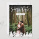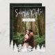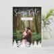 Une carte de sauvegarde de date recto-verso présentant votre propre photo sur le devant avec les mots « Save the Date » et une date de mariage personnalisable affichée sur une simple forme de ruban blanc. Le dos présente une photo de paysage forestier de Destei avec un espace pour des détails de mariage supplémentaires. Une rangée de silhouettes de sapins longe le bas, ajoutant une touche de forêt. Parfait pour les mariages de randonnée, les célébrations en plein air et les événements inspirés de la nature, cette carte élégante mélange des moments personnels avec une beauté scénique.