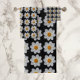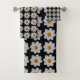 Ensemble de serviettes de bain qui comprend une photo d'une fleur Dahlia blanche avec centre jaune sur un arrière - plan noir et imprimé dans un motif extensible. Un joli design floral ! Commandez les serviettes séparément ou en set.