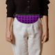 Fanny pack élégant avec garniture noire pour la personne en déplacement et présente l'image photo d'une fleur violette Cranesbill Geranium sur un arrière - plan noir et imprimé dans un motif carrelé. Un design floral et amusant ! Le dos du sac de nourrice est noir.