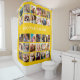 Personalized bathroom shower curtain featuring a sunflower yellow background that can be changed to any color, a text template, and a 30 square photo collage for you to customize to your own pictures.