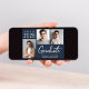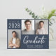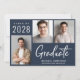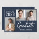 Modern dark blue graduation announcement and party invitation featuring a 3 photo collage, "Graduate" in large white letters and the grad's class year, name and school or university in simple white typography. Add your party details on the reverse side.