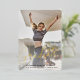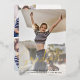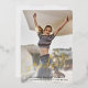 On the front of the invitations is a full-bleed photo with a fashionable modern Graduate shiny real foil typography overlay, as well as the graduate's name, school name, and class year. The reverse of the card may be customized with two extra photos on the left side, the names of the graduate's parents on the right side, and information about the graduation ceremony on the left side.
