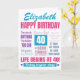 A modern typography 40th birthday card in pink, purple and blue. This fabulous card can be personalized with the name of the fortieth birthday recipient. It contains several birthday quotes including 'life begins at 40' and 40 years loved'.