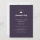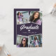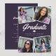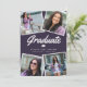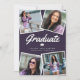 Double sided Modern Photo Collage Graduation Party Invitation. Design features four square pictures of the grad, a motarboard, the text GRADUATE in trendy lettering on a deep purple background that can be changed to any colour. On the reverse you can add all your party details using the customizable template.