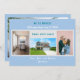 Minimalist, elegant, trendy moving announcement card with 3+1 custom photos, the names of family members, and the text "We've Moved! Come visit us soon!" + the new address and landline phone number on the front for you to personalize. Modern, chic powder blue background with white and teal writing.