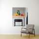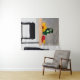 Tapestry in a modern, Boho style abstract of a tabletop and atool, with a still life arrangement of pitcher and fruit, in shades of soft grey, black and beige, accented with red and golden yellow