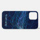 This modern iPhone case features an abstract blue design with a custom name at the bottom.