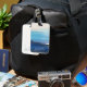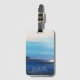 A modern luggage tag design with an abstract paint effect background fading from navy blue, to light blue and then cream. At the bottom, in off white script typography, you can customize with your name.