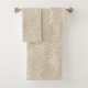 This bath towel set features a modern abstract brush stroke pattern in white on khaki tan for a contemporary, neutral look.