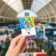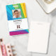Company employee identification badge with templates created for you. Background is a modern abstract in a rainbow sunray pattern.