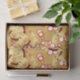 Tissue paper in a Mid-Century Modern abstract pattern of spirals and dots, with the look of confetti tossed in the air, in shades of chocolate brown, rust, and soft chamois yellow, accented with white, against a deep mustard gold background