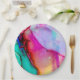 A paper plate with a fancy artistic abstract design. Watercolor painting with the colours mixing and mingling creating a nice flowing marbled pattern.