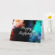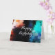 A birthday card with a greeting inside which can be customized or left as is. Designed with a modern abstract design. Paint splatters and swirling colours in turquoise, white, orange and black with hints of blue.