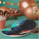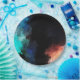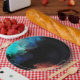 Paper plates with a modern abstract design. Paint splatters and swirling colours in turquoise, white, orange and black with hints of blue.