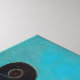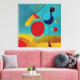 This whimsical abstract graphic features the colours red, yellow and shades of blue.