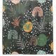 A sophisticated and trendy surface design that blends organic and geometric elements for a contemporary aesthetic. This seamless pattern features bold abstract shapes, including stylized tropical leaves in white line art and solid green/orange fills, set against a dark background with terrazzo-style white flecks. Modern rainbow motifs and organic circles in muted teal, pink, and mustard yellow complete the look.