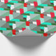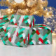 Wrapping paper in a Mid-Century Modern design of layered triangles in shades of turquoise, grey / grey, tomato red, and jade green, accented with white
